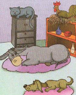 Geceleyin onlar uyurken soyguncular geri gelmisler. Ama hayvanlar hazirlikliymis. Soyguncular içeri girer girmez, esek