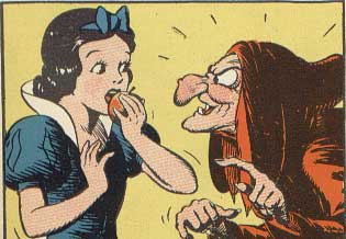"Kapiyi yabancilara açmaman akillica," demis kraliçe. "Ama lütfen su elmayi bir iyi niyet belirtisi olarak kabul et." Böyle bir seyi reddetmek ayip olacagi için Pamuk Prenses elmayi almis ve kadin gidince kocaman bir isirik almis. Cüceler isten eve döndüklerinde Pamuk Prenses'i yerde cansiz yatar bulmuslar. Elma hala elinde duruyormus. Cüceler aglayarak, "Bu kraliçenin isi!" demisler. Büyük bir kederle Pamuk Prenses'in cansiz bedenini tasiyip camdan bir tabuta koymuslar.