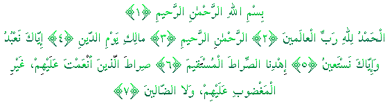 Okunusu: Elhamdü lillâhi rabbil'alemin. Errahmânir'rahim. Mâliki yevmiddin. Iyyâke na'budü ve iyyâke neste'în, Ihdinessirâtel müstakîm. Sirâtellezine en'amte aleyhim gayrilmagdûbi aleyhim ve leddâllîn. Amin